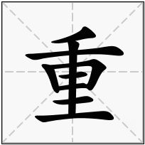 (1) (会意兼形声。金文字形,从东,从壬( tǐng),东亦声。壬,挺立。东,囊袋。人站着背囊袋,很重。《说文》:“重,厚也。” 徐锴:“壬者,人在土上,故为厚也。”本义:分量大,与“轻”相对)