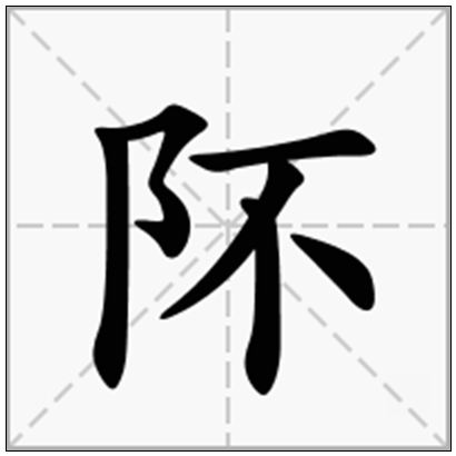 阫péi墙:“正昼为盗,日中穴阫。”(语出:《庄子·杂篇·庚桑楚》)笔画数:6;部首:阝;笔顺编号:521324