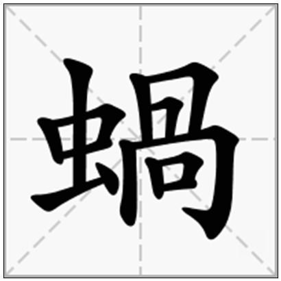 | 蝸的拼音 | wō | 蝸的繁体 | 蝸 | 蝸的部首 | 虫 |
