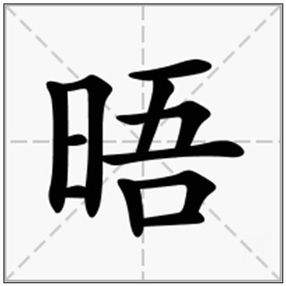 晤,形声。从日,从吾,吾亦声。“日”表示“太阳照见的地方”;“吾”表示“中立的”、“中间的”。“日”与“吾”联合起来表示“在太阳底下的中立地点见面会谈”。