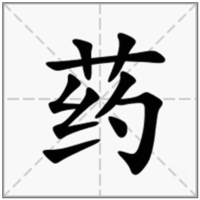 药,yao,从艸从乐。治疾病之艸緫名。会意:解除疾病,恢复快乐。指某些有化学作用的物质[certain chemicals] 药稍熔,则以一平板按其面,则字平如砥(药稍稍化开,此指松脂、腊等)。