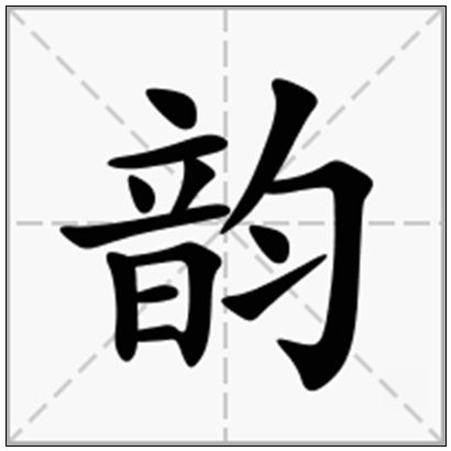 韵是形声字,音为形,匀为声。旧多写作均。韵的本意指和谐的声音,也指风度、气质、情趣。韵也指一个音节中声母、介音以外的部分,如ang、iang、uang是三个韵母,但同是ang韵。在古代,声调不同,又分别属于不同的韵。现代韵又指韵母。