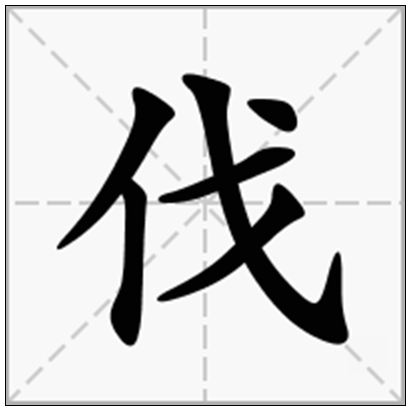 汉语汉字,拼音:fá。含义:①砍:伐树。砍伐。 ②征讨:讨伐。伐罪(征讨有罪的人)。口诛笔伐。 ③自夸:伐善(夸自己的好处)。伐智。不矜不伐。笔画数:6,部首:亻,笔顺编号:321534。