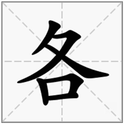 各(gè,gě),从夊从口。异辞也。夊,夊者,有行而止之,不相听也。中国汉字之一,意思是每个,彼此不同:各别。各得其所、各尽所能、各有千秋、各自为政。