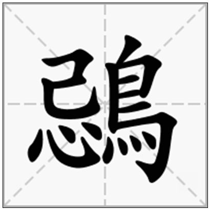 鵋 jì,部首: 鸟 部首笔画: 11 总笔画: 18五笔86:NNWO五笔98:NNQO仓颉:SPHAF笔顺编号:515454432511154444 四角号码:17327 UniCode:CJK 统一汉字 U+9D4B鵋jì〔鵋鶀(qí)〕猫头鹰。康熙字典:【亥集中】【鸟字部】鵋 ·康熙笔画:18 ·部外笔画:7【广韵】【集韵】【韵会】𠀤渠记切,音忌。鵋?,鸺鶹鸟,今之角鸱。一名鵅。