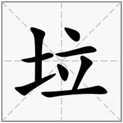 【字形字义】会意字。“立”意为“独立”。“土”指“土块”。“土”与“立”联合起来表示“独立土块”。本义:独立的土块。多余的土块。突兀的土块。辨析:垃和圾。“垃”指平整地面上散落的多余土块,它们不是地面的一部分,应当拿掉,以保持地面的整洁。“圾”指手头边的土块,可以轻易搬动。“垃圾”一词原意是“手头边多余的土块”。