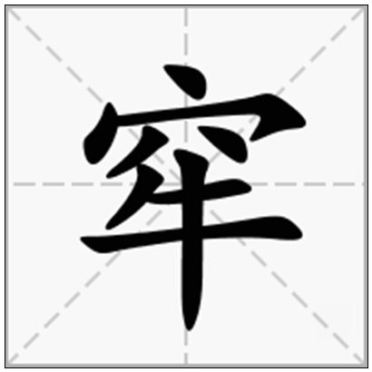 窂láo古同“牢”。笔顺编号:445343112;笔顺读写:点、点、横钩、撇、点、横、竖、横。