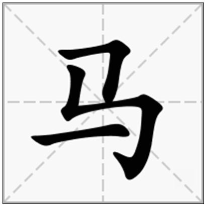 象形:早期金文字形,象马眼、马鬃、马尾之形。“马”是汉字的一个部首。本义:家畜名。单蹄食草大型哺乳动物,英文名称:[Horse]。史前即为人类所驯化,用作驮畜、挽畜和乘骑;它和其他现存的马属和马科动物的区别是尾毛和鬃毛长,后腿飞节内下方有一块胼胝,还有一些非固定特征)如体型较大、蹄子较大、颈稍呈弓形、头小、耳短)